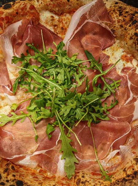 Mozzarella, tomato sauce, arugula, prosciutto, olives, parmesan, stracciatella di bufala