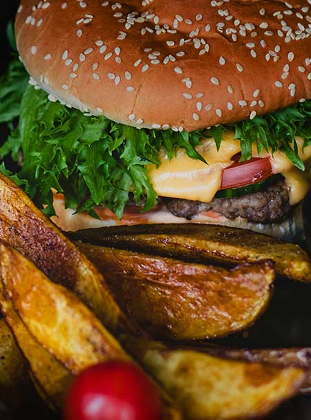 Double Decker - Domača bombetka, dvojna zorjena goveja pleskavica, dvojni čedar sir, solata, domača BBQ omaka, domač kečap, slanina, krompirček